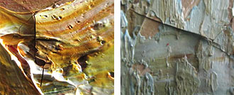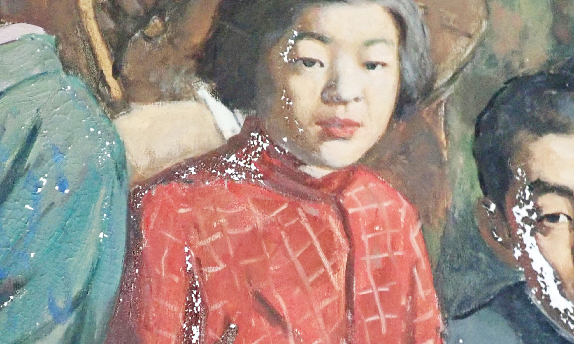 損傷状態/絵具層に亀裂が大きく入り、そこが剥離してさらに剥落も進んでいる。絵具層は堅牢だが、キャンバスとの定着が弱く、今後も注意が必要と思われる。表面に付着物もある