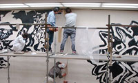 十八銀行の体育館にあった洋画家、野見山暁治氏の壁画作品を十八銀行本店のロビー壁面に移設して修復作業を行った。