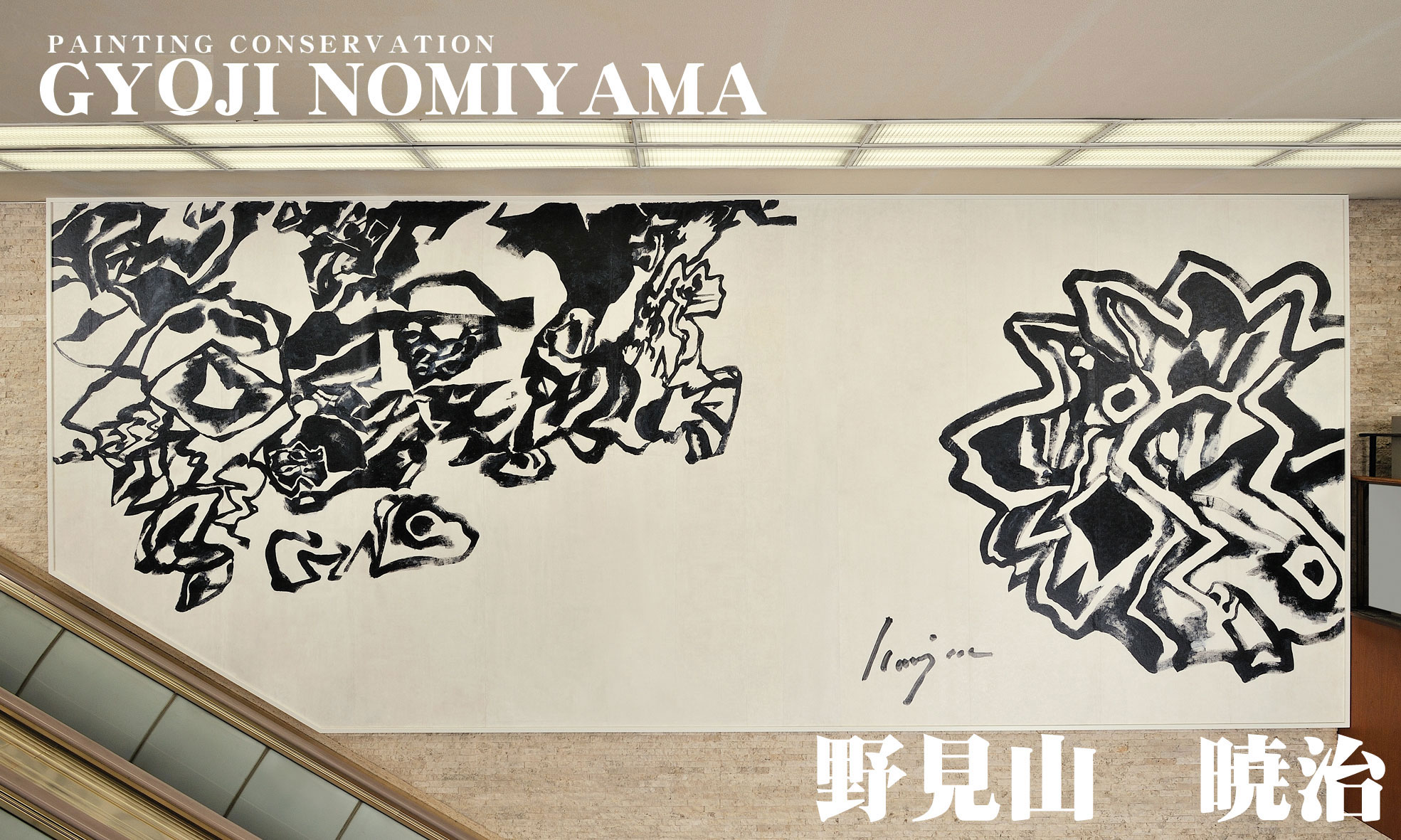 十八銀行体育館に設置の画家野見山暁治氏作「コスモ」の壁画を十八銀行本店ロビー壁画に移設修復